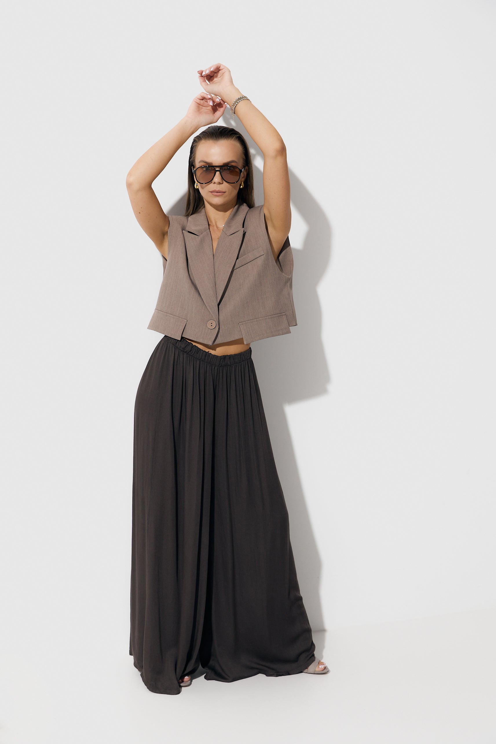 Minimalizm, który robi wrażenie. Krótka kamizelka z poduszkami w ramionach to mocna konstrukcja oparta na prostych liniach, oversize'owym kroju i zdecydowanej formie. Idealna jako element warstwowy - sprawdzi się zarówno z dopasowaną sukienką, jak i luźnym t-shirtem czy bluzą.