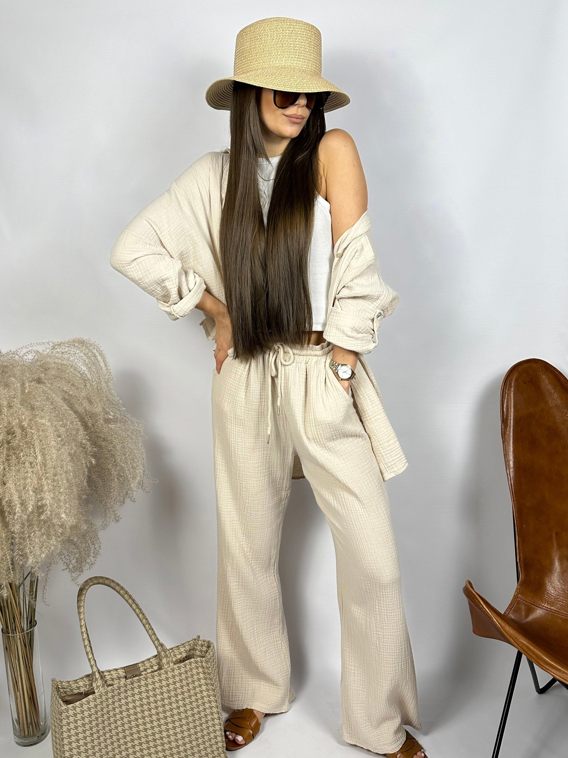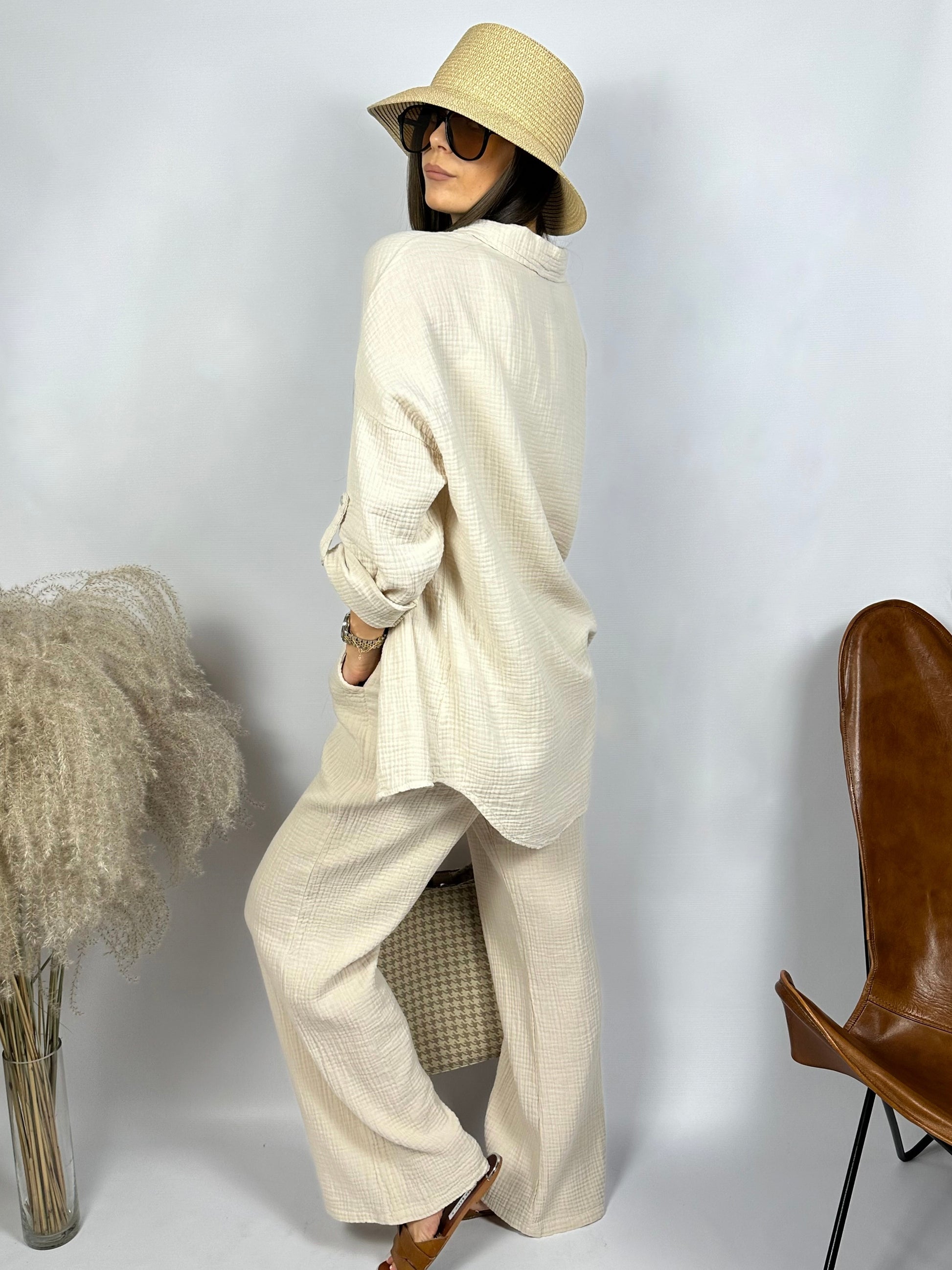 Oversizowa koszula z długimi rękawami zapinana na guziki. Dołączone do niej spodnie o kroju wide leg z szerokimi nogawkami, posiadają gumkę ze ściągaczem w pasie, dzięki której doskonale dopasowują się do sylwetki. Z przodu znajdują się funkcjonalne kieszenie.