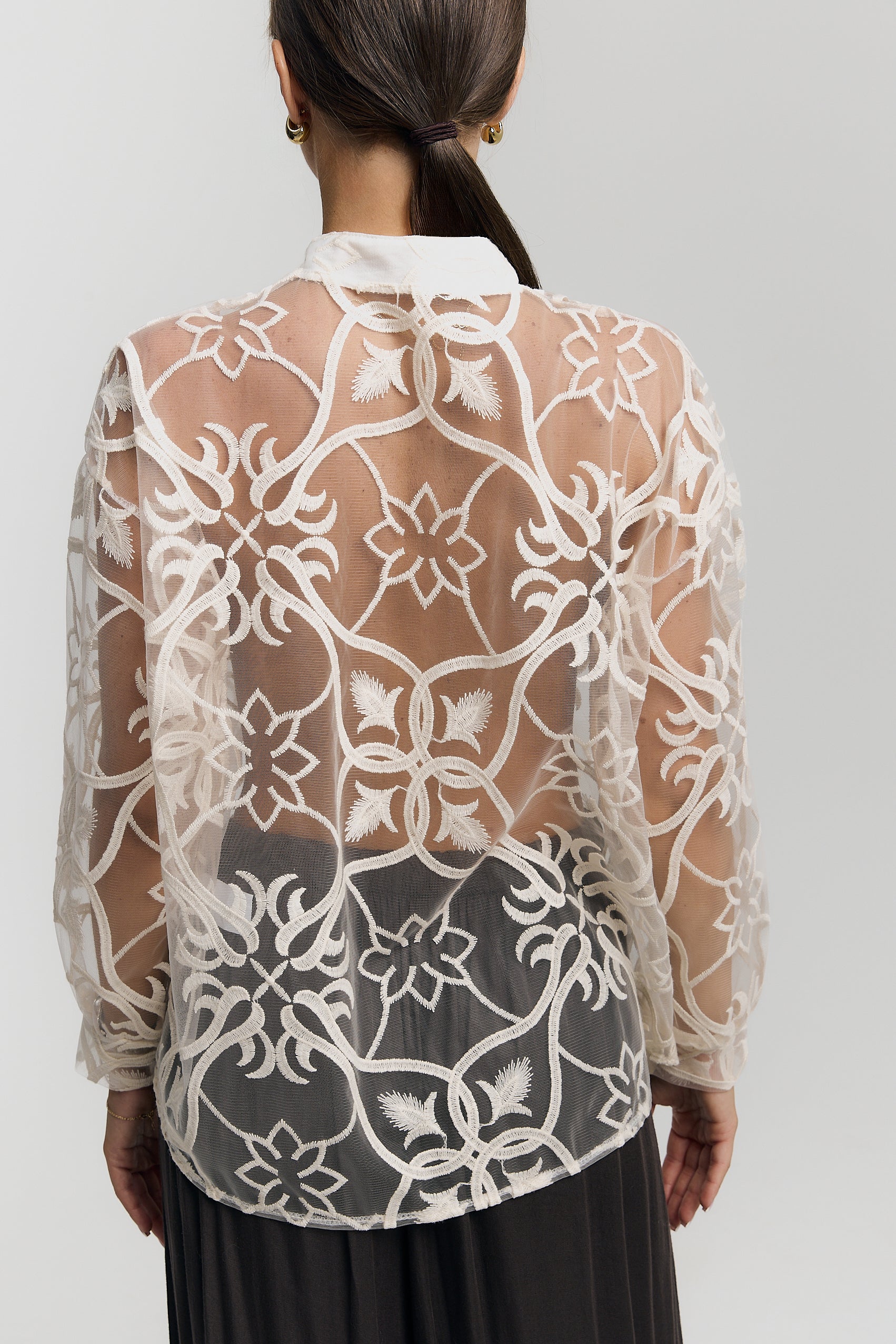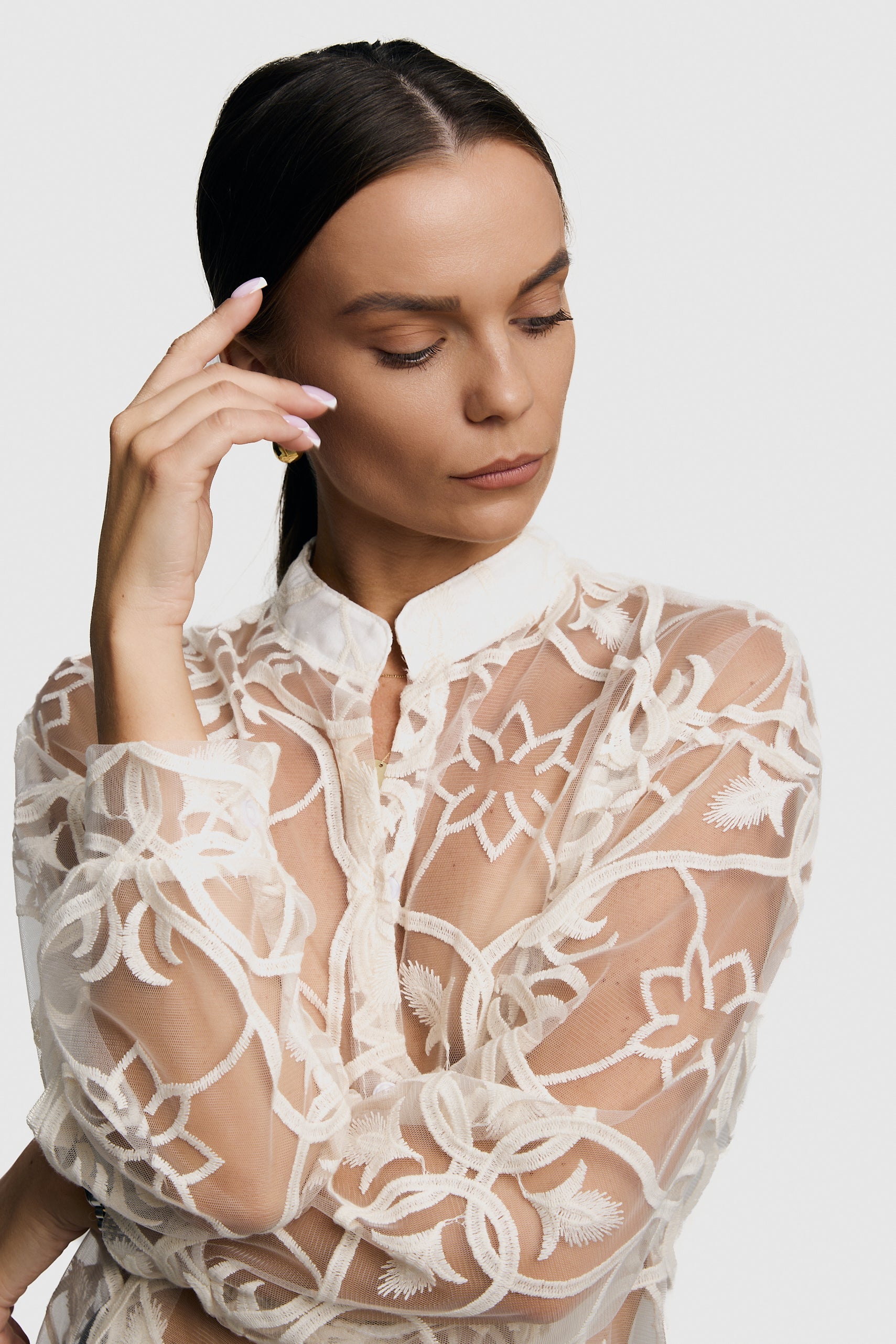 Delikatna i zmysłowa koszula, która subtelnie podkreśla kobiecą sylwetkę. Uszyta z lekkiej, półprzezroczystej tkaniny, ozdobiona finezyjnym wzorem kwiatów – idealna na romantyczne stylizacje i wyjątkowe okazje. Transparentność materiału nadaje całości lekkości, a kwiatowy print dodaje elegancji i świeżości.