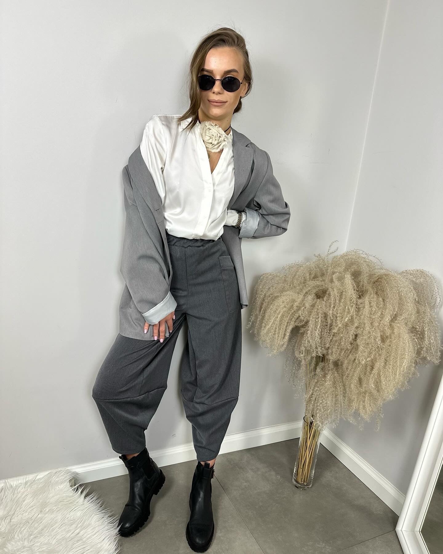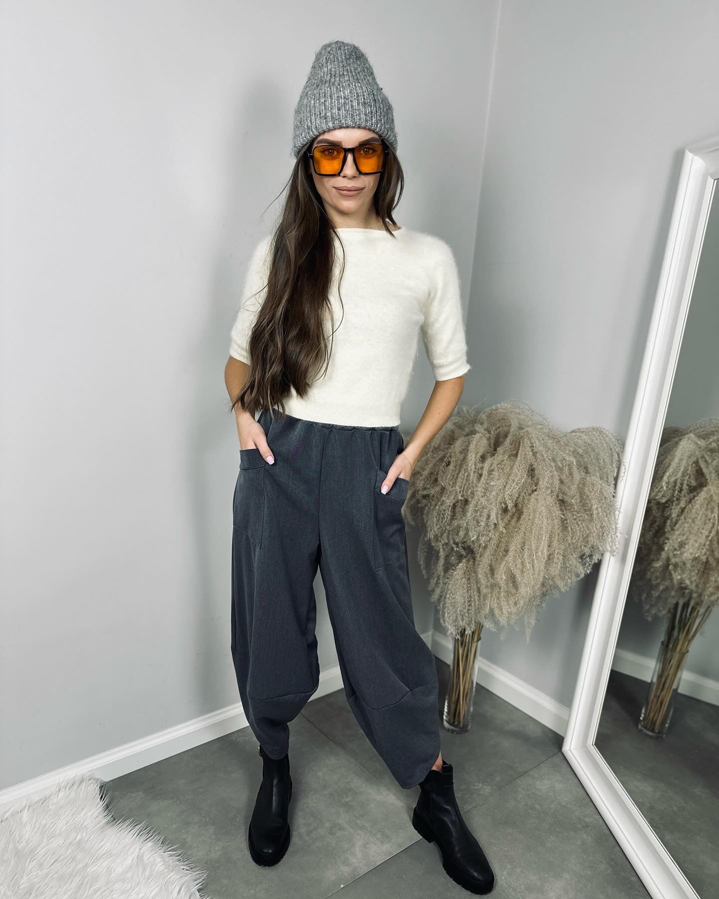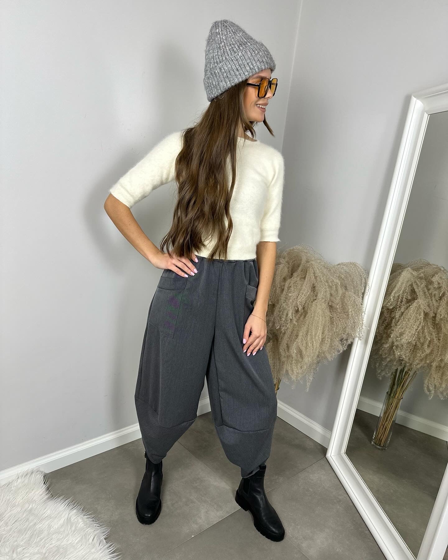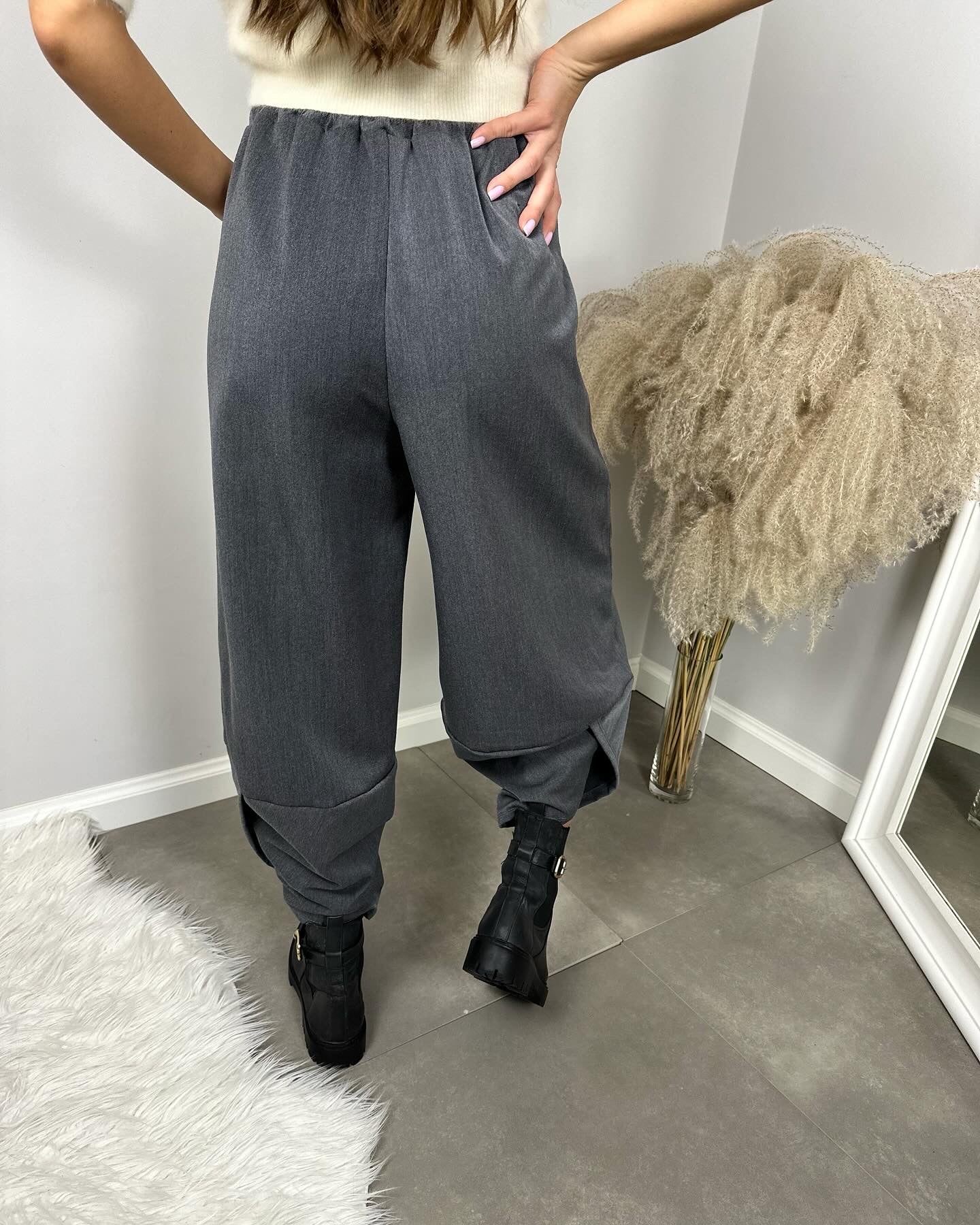 Spodnie Marle, które doskonale sprawdzą się w różnych stylizacjach, idealnie komponują się ze szpilkami, czy cięższym obuwiem. Spodnie posiadają gumkę w pasie, głębsze kieszenie i asymetryczne wykończenie nogawki.