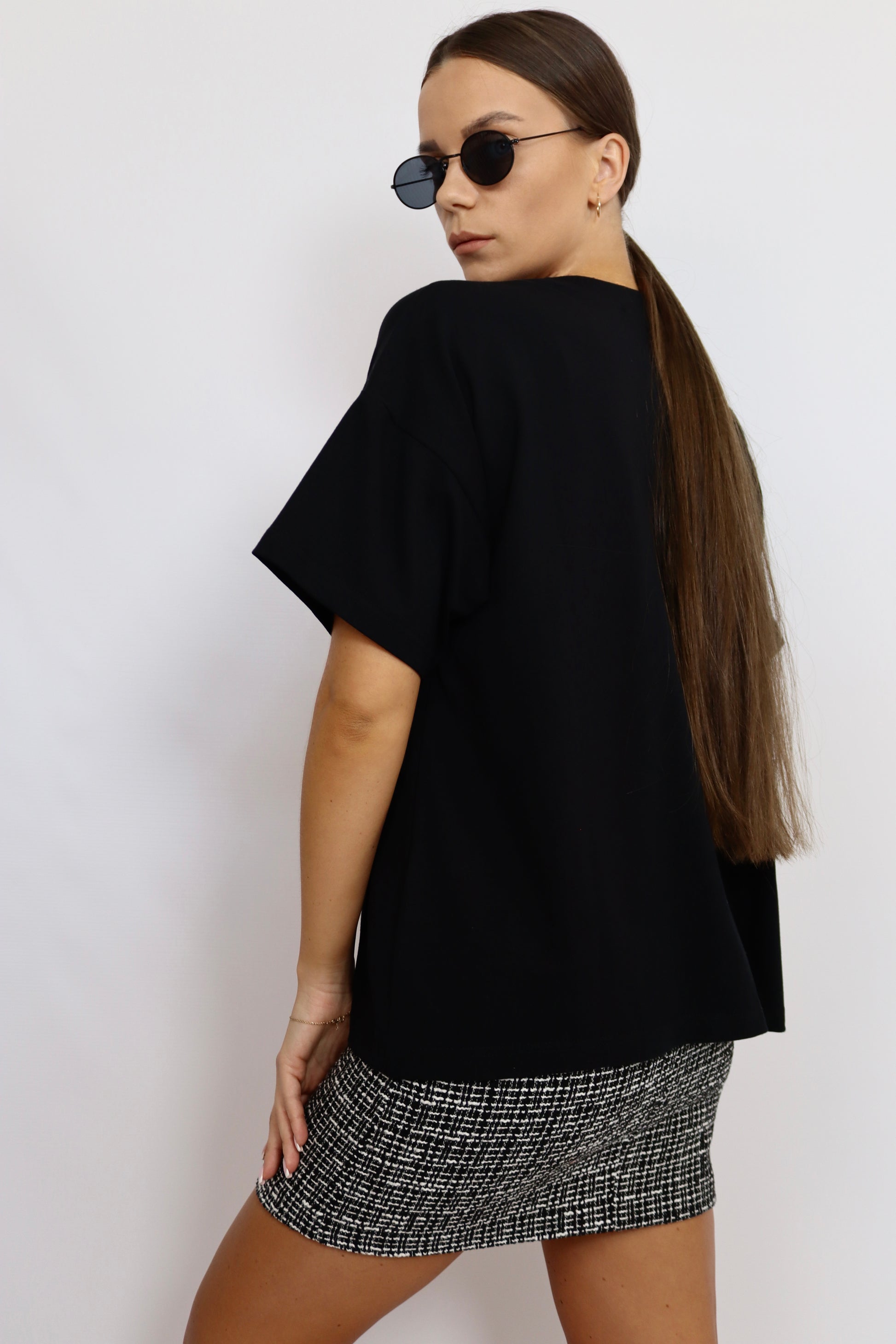 Klasyczny czarny T-shirt to ponadczasowa baza każdej garderoby. Wykonany z wysokiej jakości materiału, zapewnia komfort noszenia i swobodę ruchów. Delikatnie obniżona linia ramion nadaje mu luźniejszy, nowoczesny charakter, dzięki czemu świetnie sprawdzi się zarówno w codziennych, jak i bardziej stylizowanych zestawach. Uniwersalny fason i minimalistyczny design czynią go idealnym wyborem na każdą okazję.