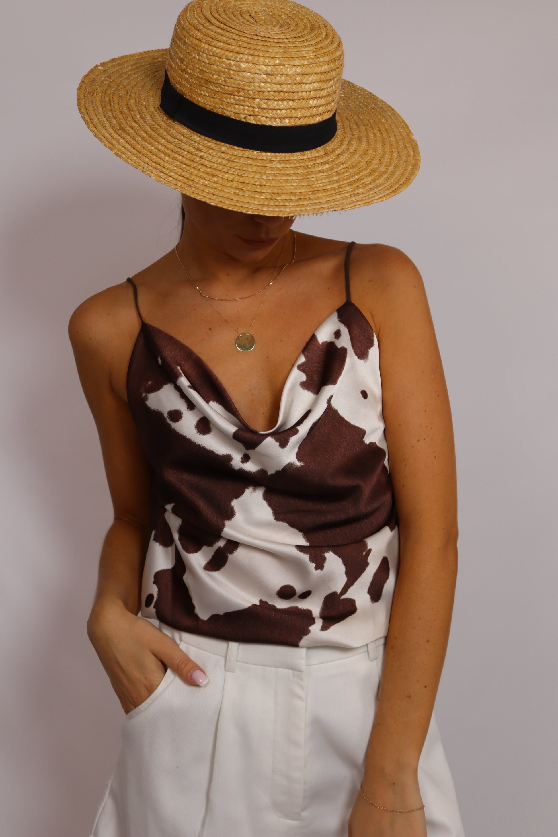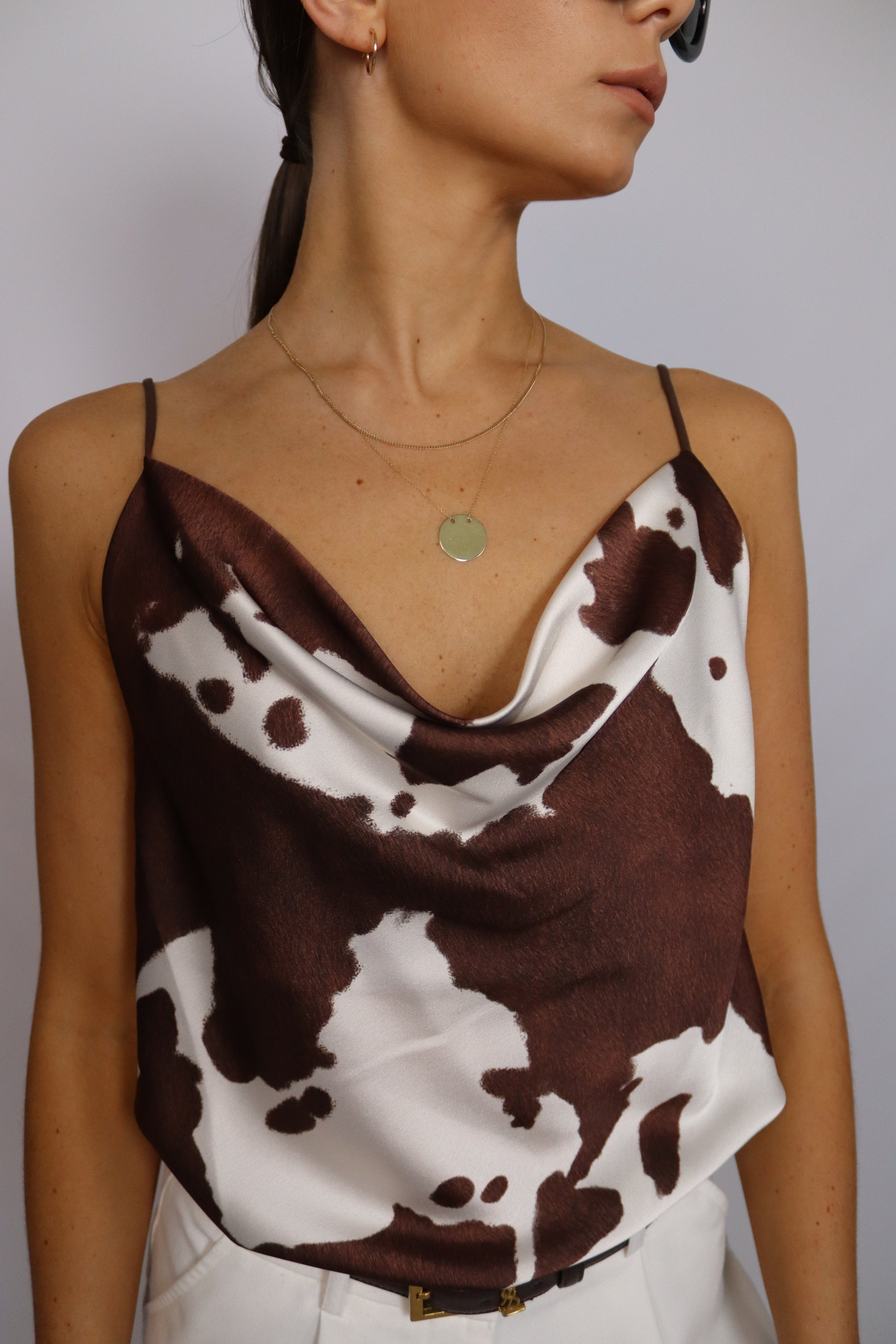 Satynowy top Monte na ramiączkach to elegancki i kobiecy element garderoby. Wyróżnia go efektowny wzór w krowie łaty, nadający stylizacji oryginalnego charakteru. Miękki, przyjemny w dotyku materiał oraz prosty, ale podkreślający sylwetkę krój sprawiają, że top jest nie tylko stylowy, ale i komfortowy w noszeniu. Obecnie dostępny w limitowanej wersji — to unikatowa propozycja dla kobiet ceniących odważną elegancję i wyjątkowe detale.